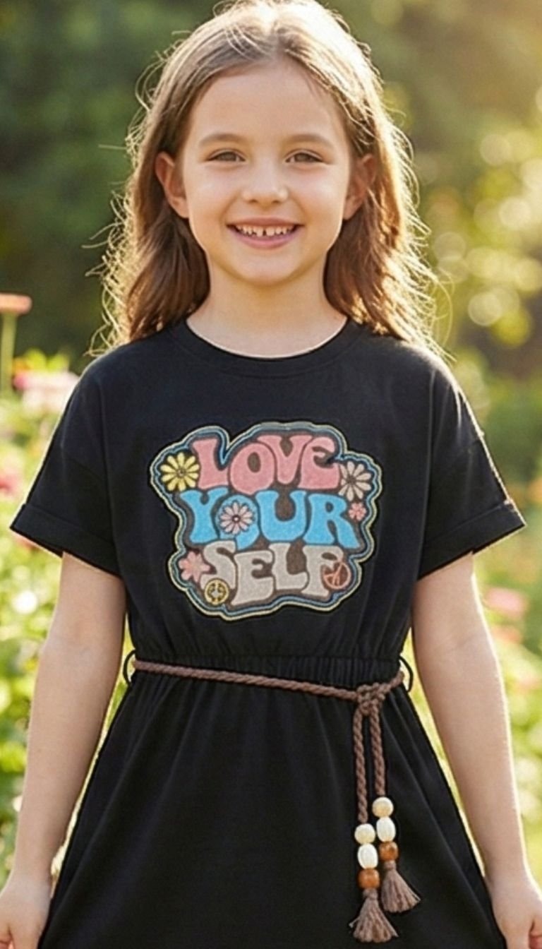 Bring bold attitude and positive vibes together with the “Love Yourself” Boho T-Shirt Dress in classic black. The striking black base contrasts beautifully with the colorful 70s bubble-letter graphic and floral peace symbol, creating a statement piece that encourages self-love and confidence. It’s the ideal dress to wear her message loud and proud, anytime, anywhere.