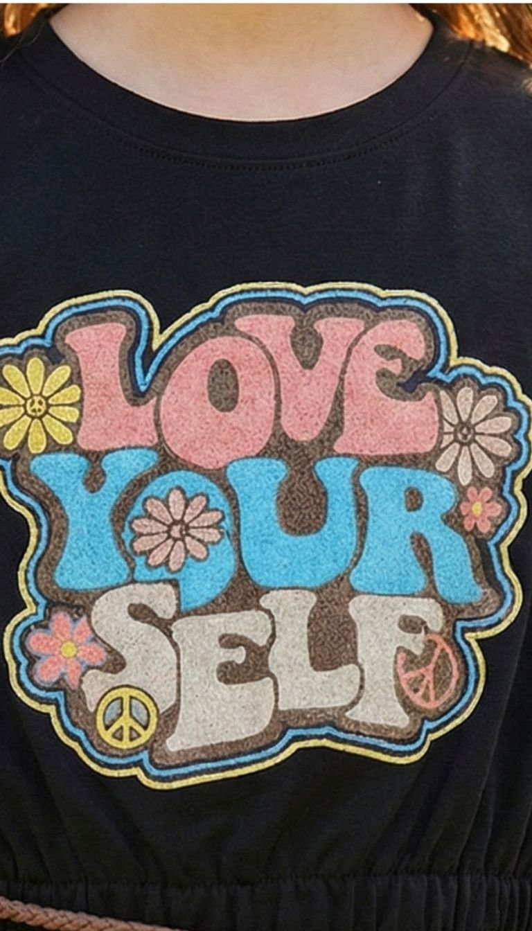 - Features a vibrant 70s-inspired “LOVE YOURSELF” graphic with flowers and a peace sign that really pops on black.