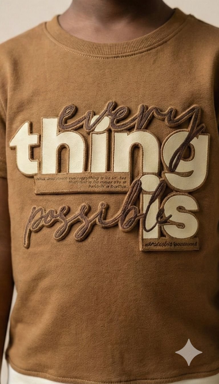 - Earthy camel 2-piece co-ord set featuring the inspiring “EVERYTHING POSSIBLE” embossed graphic for confident kids.