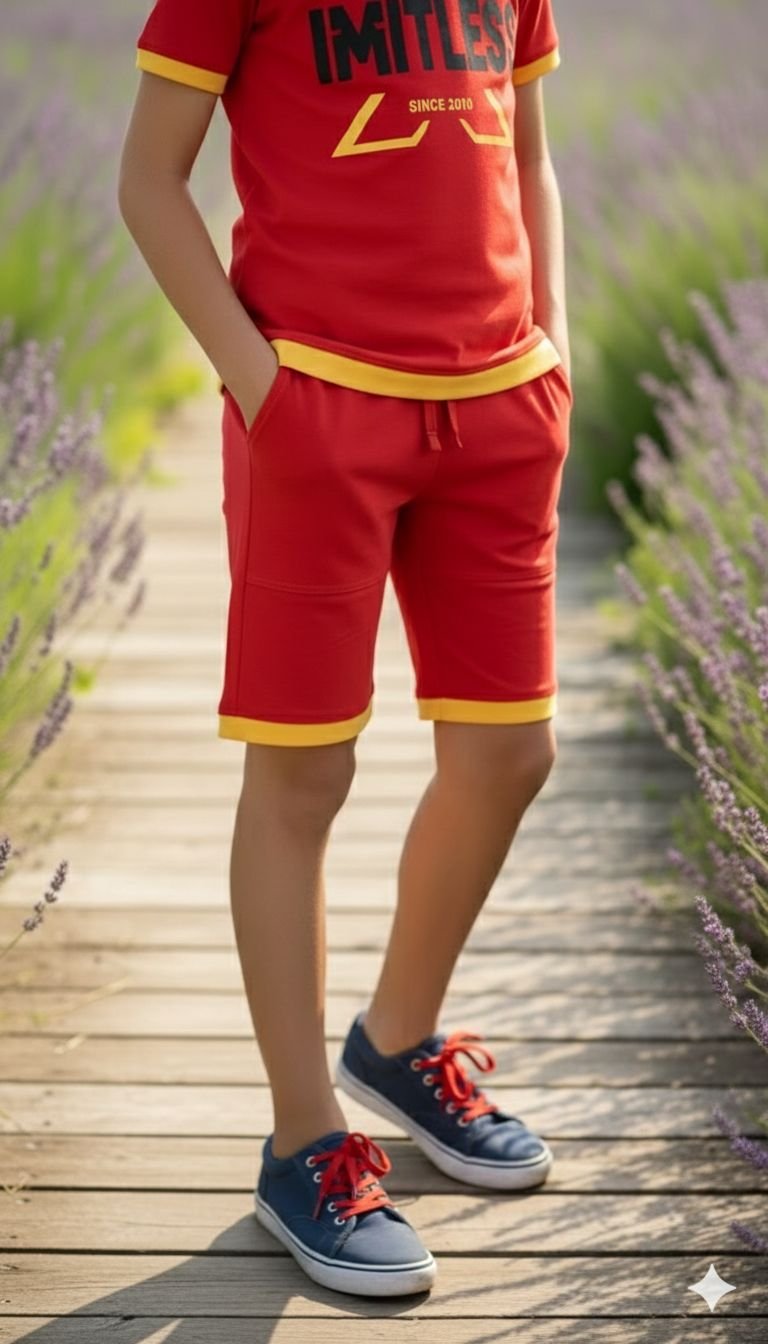 The red graphic t-shirt is the hero piece, featuring a powerful “LIMITLESS” print that inspires confidence and positive energy in every move. Crafted from soft, breathable pre-shrunk bio-washed cotton pique airtex, it feels gentle on young skin while keeping them cool during active play. Contrast ribbed trim on the crew neck and hem in bold yellow adds a retro-sporty twist that keeps the look sharp, not basic.