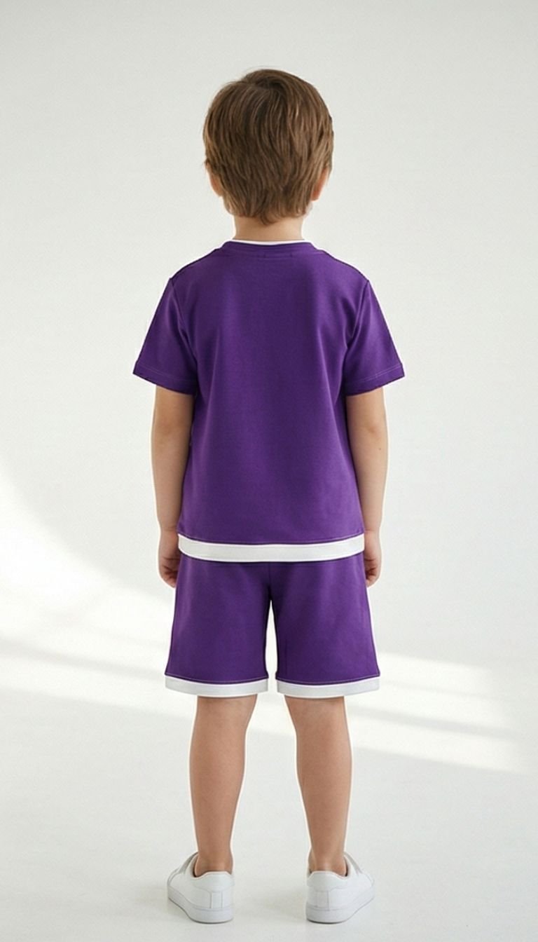 - Crisp white contrast trims on collar, hem, and shorts cuffs add a fresh, sporty touch to the vibrant purple.