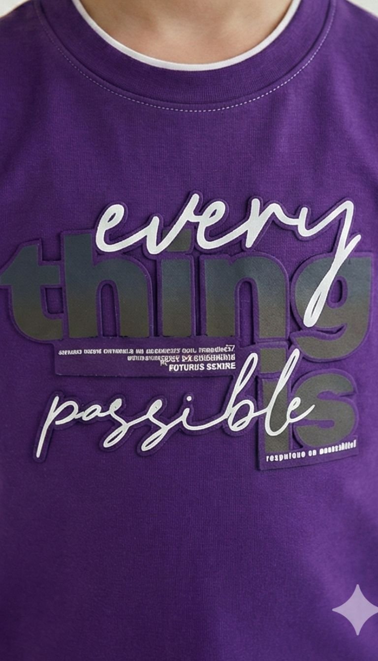 The rich purple tee is made from pre-shrunk bio-washed cotton pique airtex, offering soft, breathable comfort that’s gentle on skin and ideal for active kids. The embossed “EVERYTHING POSSIBLE” graphic stands out with a modern design, while the white contrast ribbed trims on the crew neck and hem add a bright, clean finish to the look.