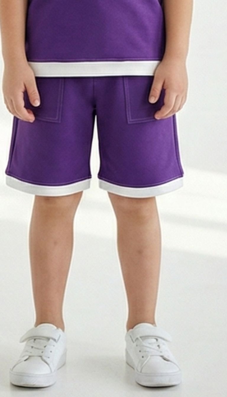 - 1 x Pull-on rich purple shorts with white contrast cuffs