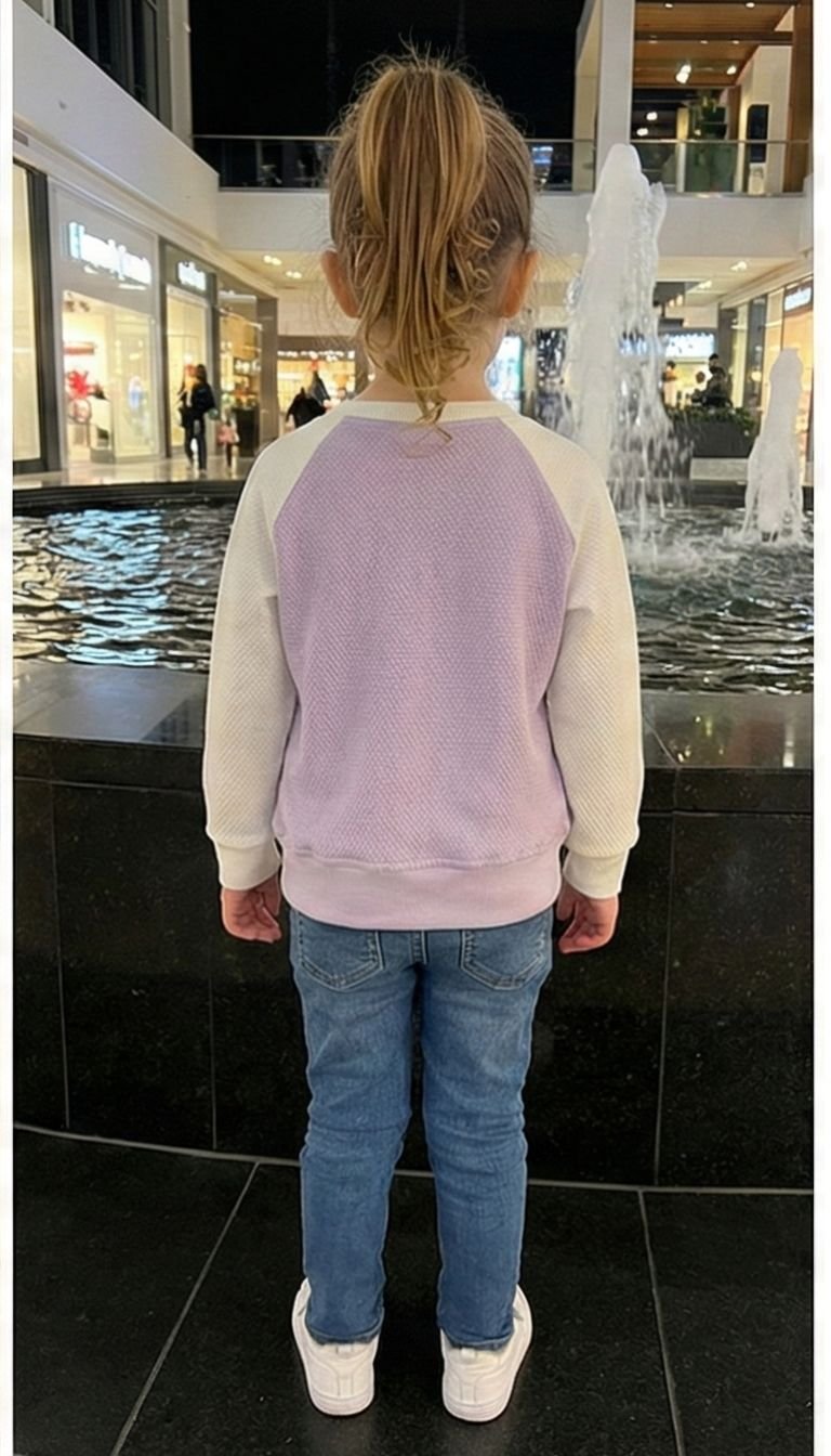 With its classic raglan sleeve design, this lilac purple tee offers a relaxed, sporty fit that lets kids climb, run, and play without tight or restrictive shoulder seams. Soft ribbed cuffs and a matching ribbed hem help keep sleeves in place and warmth in, creating a neat pullover-style silhouette that pairs perfectly with jeans, joggers, leggings, or skirts.